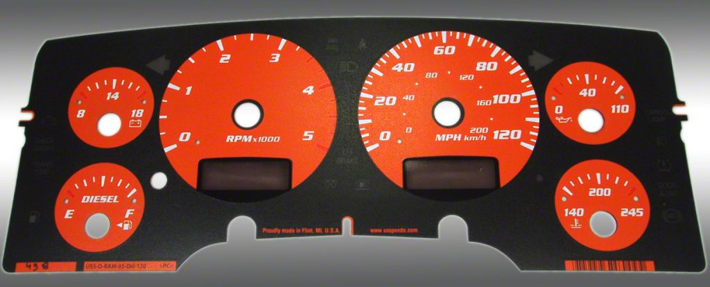 Application. This US Speedo Daytona Edition Gauge Face; KMH; Orange fits 2003-2005 5.9L RAM 2500s.