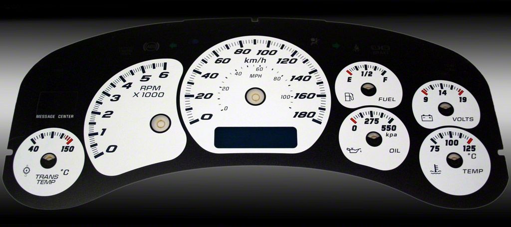 US Speedo Daytona Edition Gauge Face; KMH; White (99-02 Sierra 1500 w/ Transmission Temperature Gauge)Find parts that fit my vehicle
