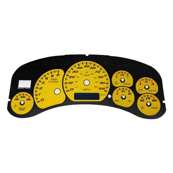 Application. This US Speedo Daytona Edition Gauge Face (MPH, Yellow) fits all 1999-2002 Chevrolet Silverado 1500 Models with Transmission Temperature Gauge.