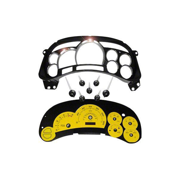 Construction and Appearance. Crafted from durable polycarbonate, the yellow gauge face is screen-printed to match OEM specifications. The chrome lens adds a sleek finish, complemented by brushed nickel trim rings. Custom needles are included to complete the upscale look, providing a cohesive and refined appearance to your dashboard.