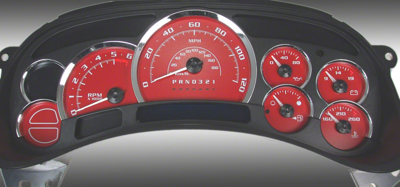 Application. This US Speedo Escalade Edition Gauge Face; MPH; Red fits 2006 Silverado 1500s.