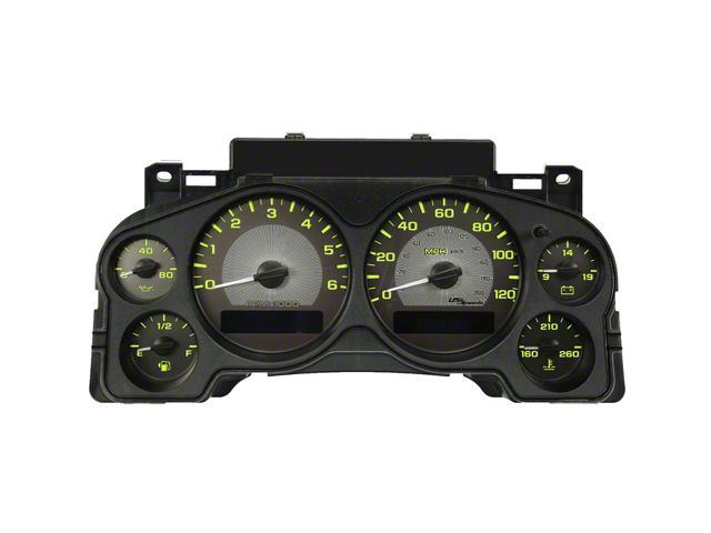 Sleek and Stealthy Upgrade. The US Speedo Gauge Face offers a stylish and functional enhancement for your 2007-2013 Silverado 1500 models. Featuring a matte black finish with lime yellow-green notations, this MPH model gauge face adds a stealthy and modern look to your vehicle’s dashboard, making it both attractive and easy to read.