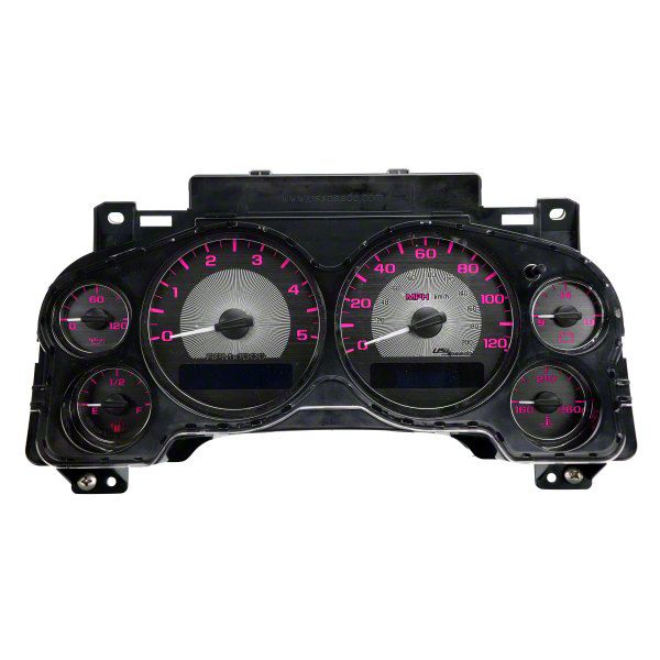 Stylish Dark Pink and Matte Black Replacement. Transform the dashboard of your 6.6L Duramax Silverado 3500 HD with the US Speedo Stealth Edition Gauge Face. This unique accessory combines a sleek matte black finish with eye-catching dark pink notations and markings, offering a striking contrast that enhances visibility and adds a personal touch to your vehicle's interior. Crafted from durable stainless steel, this gauge face is designed as a direct replacement, ensuring a perfect fit and an easy upgrade process.