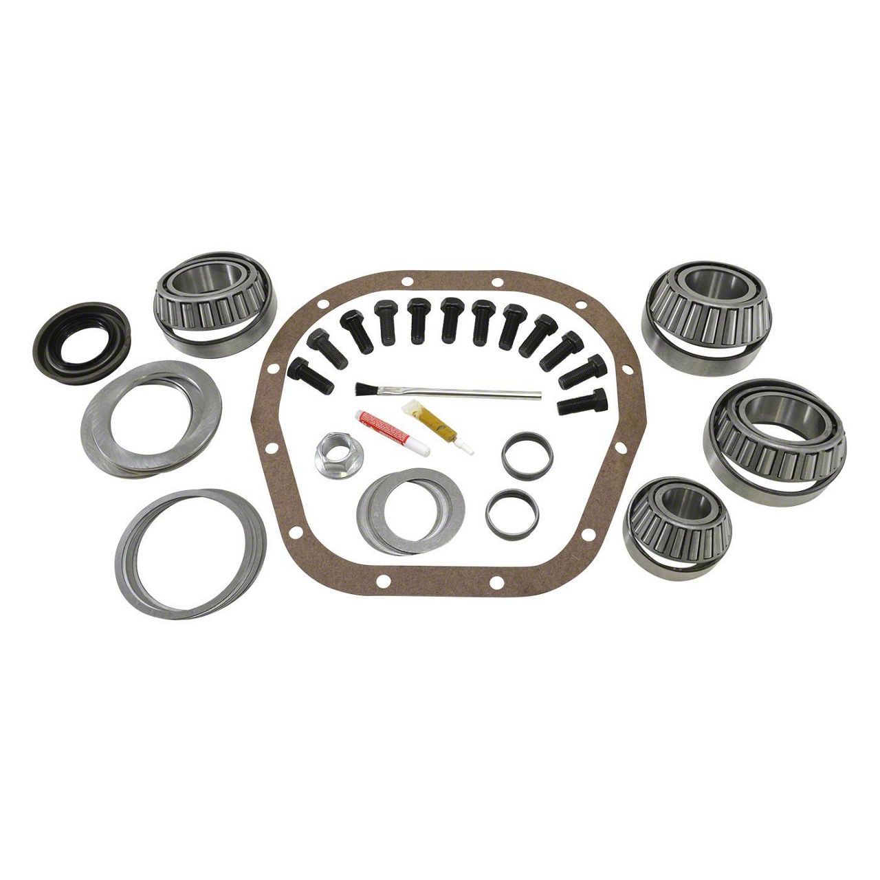 Included are carrier bearings and races, pinion bearings and races, pinion seal, complete shim kit, ring gear bolts, pinion nut, crush sleeve, oil baffles and slingers, thread locker, marking compound with brush and gasket.