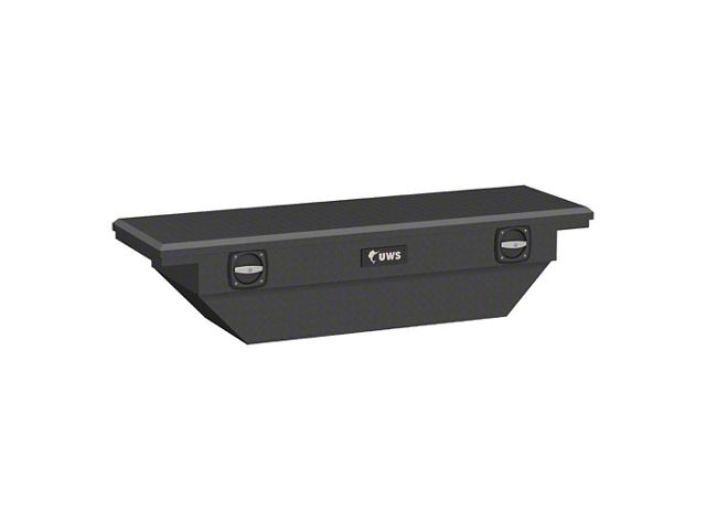 Enhanced Storage and Style. Elevate the utility and appearance of your Ranger with the UWS 63-Inch Aluminum Low Profile Secure Lock Angled Tool Box; Matte Black. The low profile design of this tool box allows for greater visibility through the rear window, enhancing driving safety. The angled shape not only complements the contours of your ride but also maximizes the available storage space.