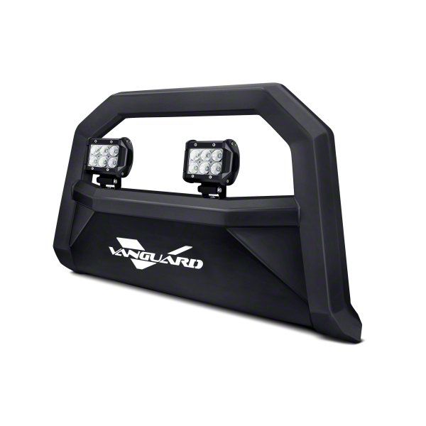 Enhanced Protection and Style. It undergoes a dual-coating process with an electrophoretic black primer and a black powder topcoat, ensuring maximum resistance to corrosion and a sleek, uniform appearance. The bull bar is not just about protection; it also illuminates your path with powerful LED cube lights, making night driving safer and more enjoyable. Additionally, it boasts a skid plate adorned with a laser-cut Vanguard logo, adding an extra layer of protection and a distinctive aesthetic touch.