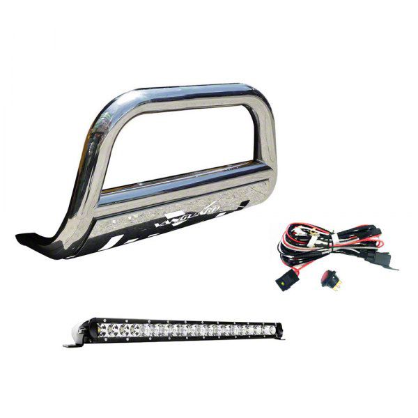 20-Inch LED Light Bar. This bull bar has pre-drilled holes for auxiliary lights. You can use these mounting holes to install the included 20-inch LED light bar to light up your nighttime travels.