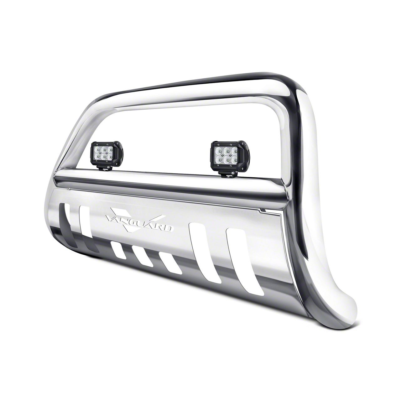 Affordable Accessory for Front-End Protection. This premium Vanguard Off-Road Bull Bar with 2.50-Inch LED Cube Lights in Stainless Steel is an affordable accessory to protect your truck’s front. It’s designed with an impact-resistant curvature to absorb shock and force. It also has a built-in skid plate with a laser-cut Vanguard logo to protect your truck’s front undercarriage against rocks and debris.