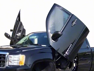 Enhanced Exterior Look. The fact that our GMC Sierra is not a Sports Car model doesn' t mean that you cannot add a sporty look to it. Vertical Doors Inc., has proven that , by creatively innovating the Vertical Doors Lambo Door Kit. These door conversion components will not compromise the feel or stock factory performance but will change the way the doors open. They feature reversible module; the door kit allows you to integrate that sporty, off-road look that catches all the attention when you pull over.