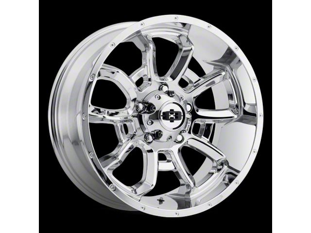 The 20x10 Vision Off-Road Bomb Chrome 8-Lug Wheel; 20x10; -25mm Offset is completed in a polished chrome finish that will make everyone green with envy. For added protection and good looks, this wheel features a durable clear coat that is tough enough to stand up against the hazards of everyday driving.