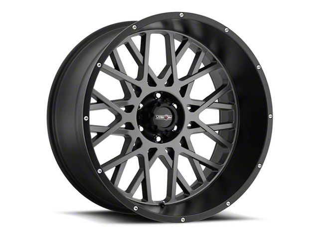 Vision Off-Road Rocker Anthracite with Satin Black Lip 8-Lug Wheel; 20x12; -51mm Offset offers a striking balance between style and durability. The design speaks to the brand's commitment to quality, enhancing the vehicle's appearance with its distinct look. This wheel, with its unique aesthetics, is ideal for drivers who appreciate a blend of modern design and robust functionality.