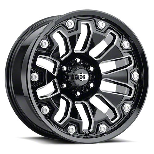 This 20x10 Vision Off-Road Armor Gloss Black Milled with Black Bolt Inserts 5-Lug Wheel is completed in a high-quality gloss black finish with milled accents and black bolt inserts to create an impressive appearance. There's a durable clear coat that protects against driving hazards.