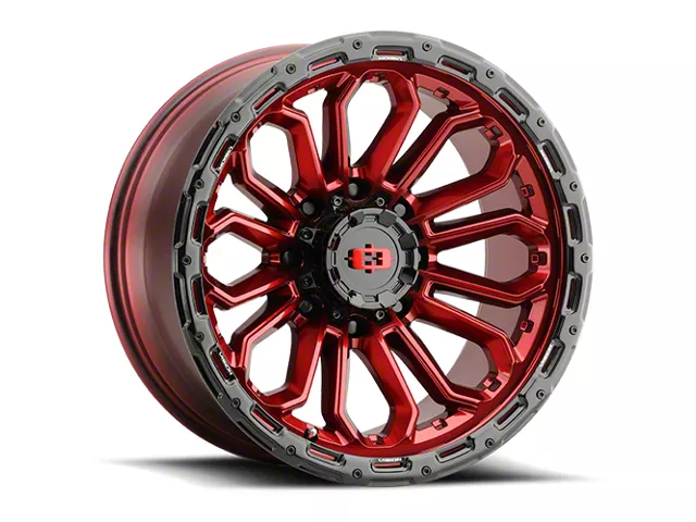 Vision Wheel Korupt Gloss Red with Gloss Black Lip 8-Lug Wheel; 20x9; -12mm Offset exudes sophistication with its finish, offering a sleek and modern appeal to any vehicle it adorns. The design is meticulously crafted to enhance the aesthetic of your vehicle, giving it a distinctive and upscale look. Perfect for those seeking to elevate their vehicle's style, this wheel blends seamlessly with both contemporary and classic vehicle designs, making it a versatile choice for a wide range of vehicles. Its robust construction ensures durability, making it a reliable choice for drivers who value both style and quality.