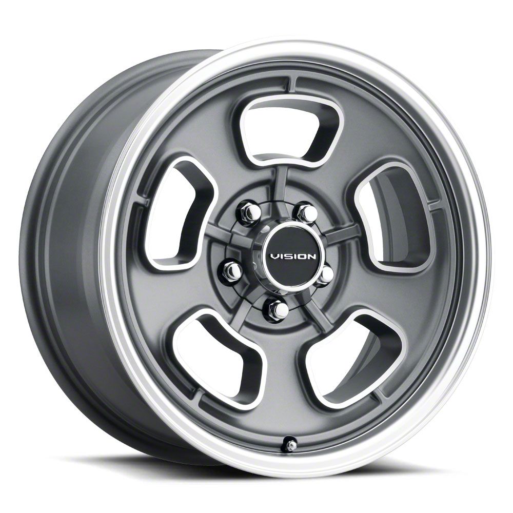 This 17x8 Vision Wheel Shift Satin Grey with Machined Face/Lip 6-Lug Wheel; 17x8; 0mm Offset is completed in a high-quality satin gray finish with steel machined accents that will be the envy of everyone. For added protection and looks, there is a clear coat that can withstand the rigors of daily driving.