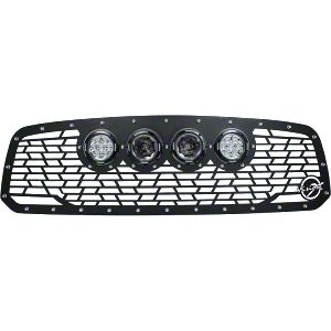 Stylish and Functional Upper Grille Upgrade. Elevate the look and functionality of your Dodge RAM 2500 with the Vision X Upper Grille. This grille features a satin black finish and includes two 4.50-inch CG2 Cannon LED lights for enhanced visibility and a sleek appearance.