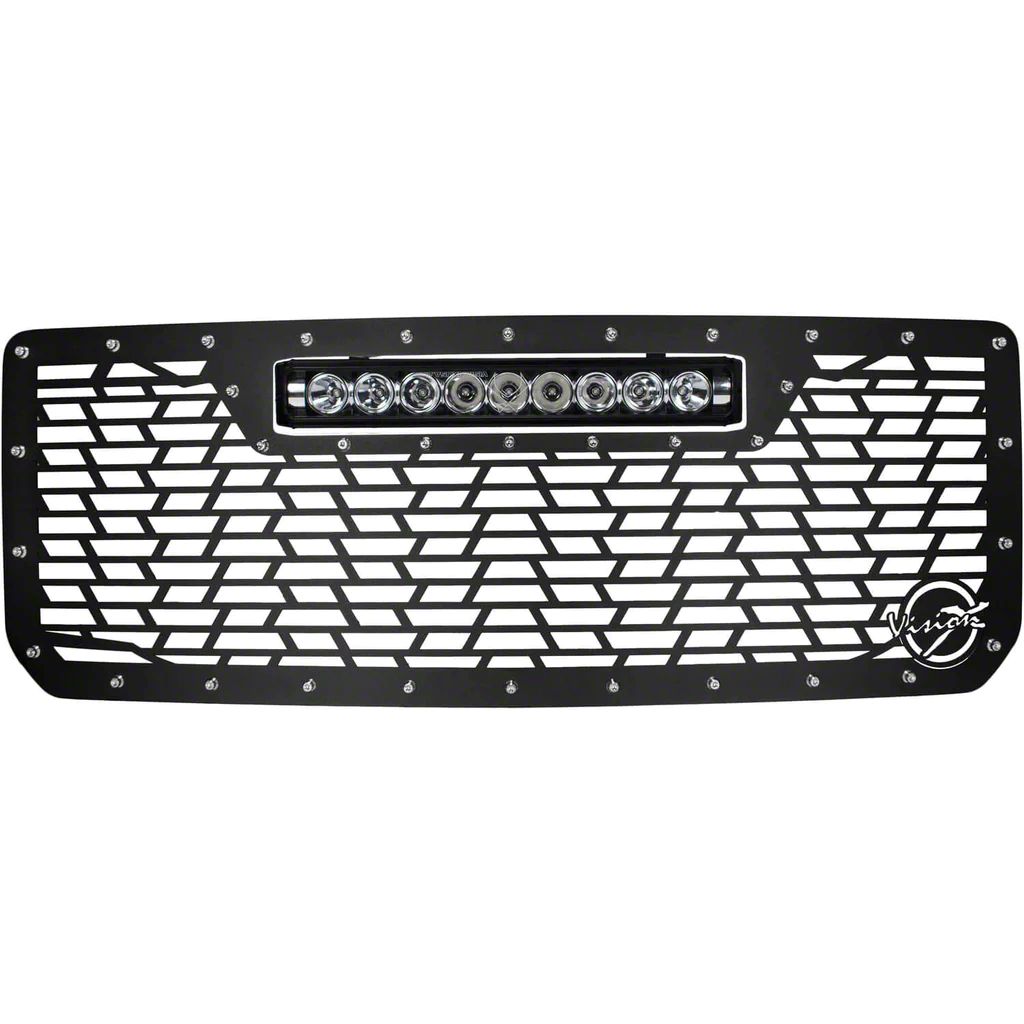 Light Bar Compatible. Made for the GMC Sierra 3500 HD, this Vision X Upper Grille offers a stylish and modern-looking upgrade instead of your ride’s stock upper grille. Coming in a satin black finish with polished chrome T-304 stainless steel studs, this grille also has an opening for a 20-inch light bar in its center for a stylish and functional upgrade.