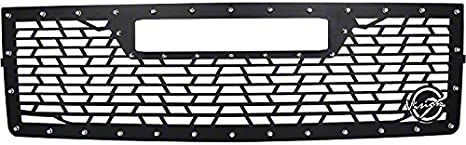 Construction and Appearance. This grille features durable stainless steel construction, ensuring longevity and resistance to the elements. It sports a satin black powder-coat finish complemented by triple chrome plated T304 stainless studs, creating a robust and stylish look with its studded edge design and geometric cutouts.