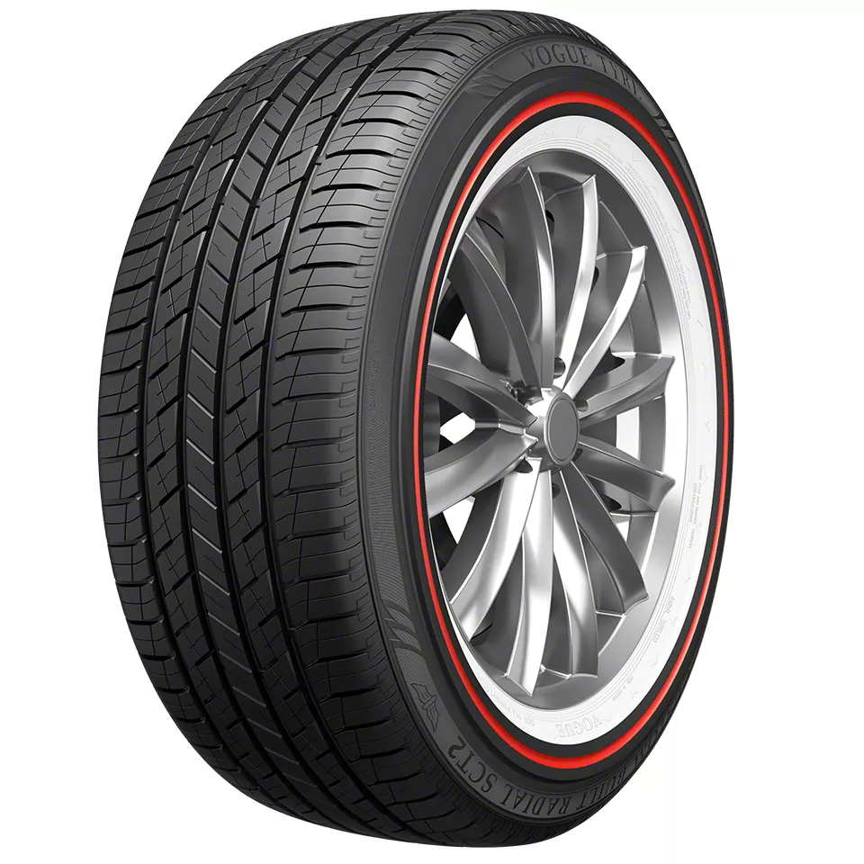 Give your SUV, Crossover or Light Truck a bold appearance with Vogue Tyre’s Custom Built Radial SCT2 Red Stripe including our exclusive white and red sidewall design. Vogue Custom Built Radial SCT2 Red Stripe tyres move you freely from the rugged world of off-road to the smooth pavement of the expressway. The wide, aggressive tread design provides superb all-season traction, handling and stability. Backed by Vogue Tyre’s industry-leading craftsmanship and care promise, the Custom Built Radial SCT2 Red Stripe offers uncompromising quality that delivers the ideal blend of style with the added benefits of enhanced wear and all-season performance.