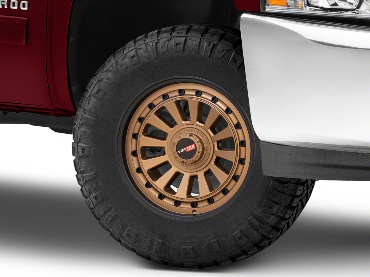 Application. This Vortek Off-Road VRD-702 Matte Bronze with Black Bolts and Lip 6-Lug Wheel; 17x9; 0mm Offset, with a backspacing of 5 Inch, 127mm; and bolt pattern of 6 x 139.7mm (6 x 5.5-Inch), provides enhanced alignment and stability. Designed to fit the 2007-2013 Silverado 1500 models, it offers precise fitment and is sold individually.