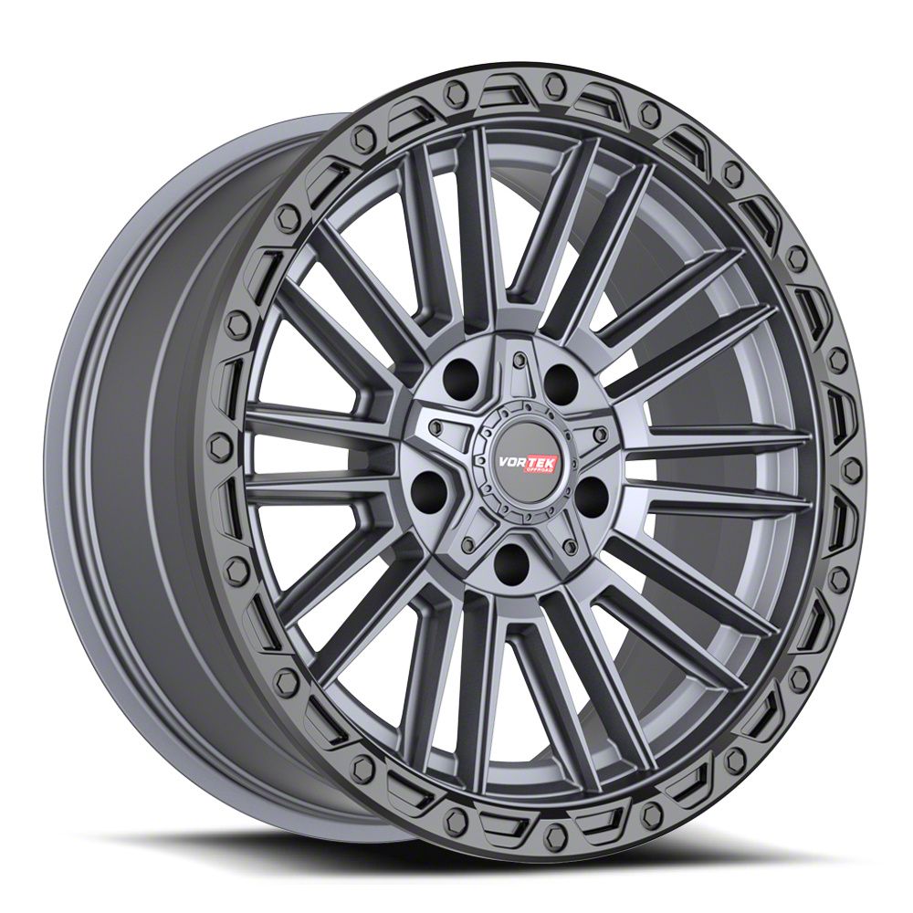 Vortek Off-Road VRT-604 Matte Titanium with Black Bead Ring 8-Lug Wheel; 18x9; 18mm Offset This Vortek Off-Road VRT-604 Matte Titanium with Black Bead Ring 8-Lug Wheel; 18x9; 18mm Offset brings a sleek and modern touch to your vehicle with its striking design. Its refined finish and bold styling make it an excellent choice for those looking to enhance their car’s visual appeal. Whether you're aiming for a sporty look or a more aggressive stance, this wheel stands out as a premium addition. Perfect for drivers who appreciate a stylish upgrade.