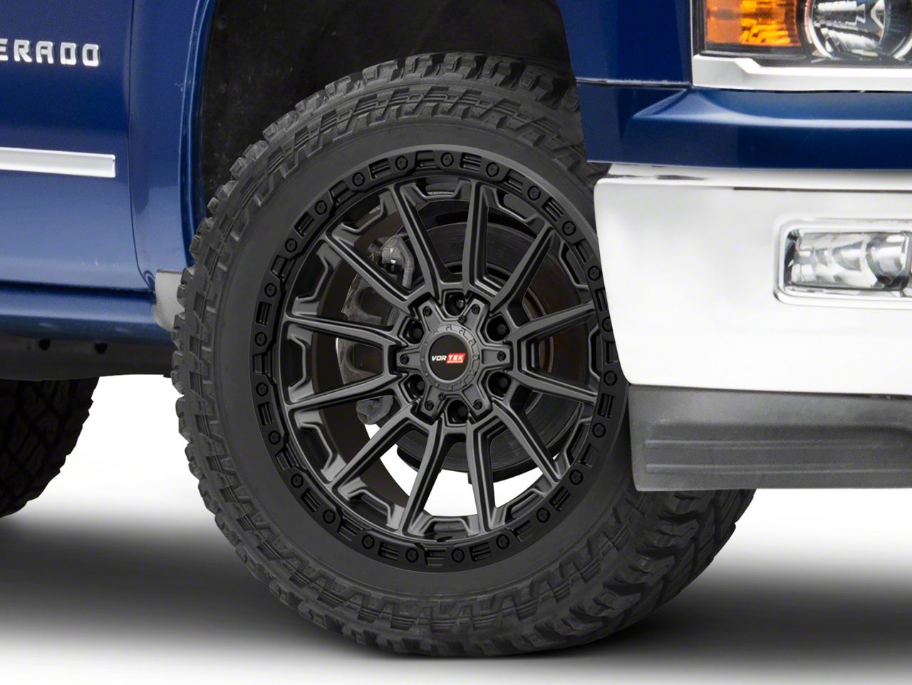 Application. This Vortek Off-Road VRT-601 Matte Titanium with Black Bead Ring 6-Lug Wheel; 22x10; -24mm Offset, with a backspace of 4.555 Inch, 115.7mm and bolt pattern of 6 x 139.7mm (6 x 5.5-Inch), ensures proper alignment and stability. It's designed to fit the 2014-2018 Silverado 1500 models, enhancing both the look and the overall driving experience. Sold individually.