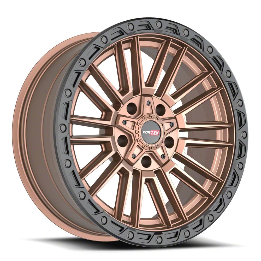 Vortek Off-Road VRT-604 Matte Bronze with Black Bead Ring 8-Lug Wheel; 20x9.5; 18mm Offset This Vortek Off-Road VRT-604 Matte Bronze with Black Bead Ring 8-Lug Wheel; 20x9.5; 18mm Offset brings a sleek and modern touch to your vehicle with its striking design. Its refined finish and bold styling make it an excellent choice for those looking to enhance their car’s visual appeal. Whether you're aiming for a sporty look or a more aggressive stance, this wheel stands out as a premium addition. Perfect for drivers who appreciate a stylish upgrade.