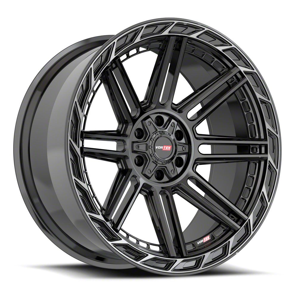 This 20x9 Vortek Off-Road VRP-501 All Black Center and Diamond Cut Ring with Dark Tint 5-Lug Wheel; 20x9; 12mm Offset is completed in a high-quality all black center finish with diamond cut ring and dark tint to make your wheel the envy of everyone. For added looks and durability, the wheels has a durable clear coat that withstand the rigors of daily driving.