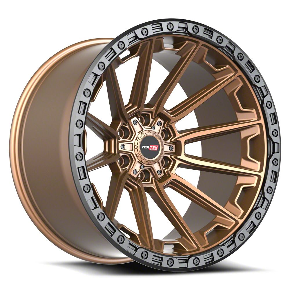 Vortek Off-Road VRT-601 Matte Bronze with Black Bead Ring 6-Lug Wheel; 24x10; -12mm Offset is a visually striking choice, offering a combination of rugged durability and modern styling. Its design complements off-road and sporty vehicles alike, enhancing the overall aesthetic appeal.