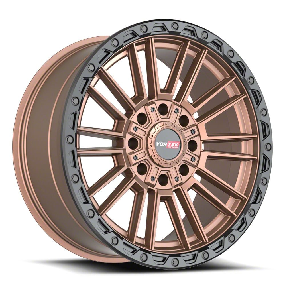 This 17x9 Vortek Off-Road VRT-604 Matte Bronze with Black Bead Ring 8-Lug Wheel; 17x9; 0mm Offset is completed in a high-quality matte bronze finish with black accents to make your wheel the envy of everyone. For added looks and durability, the wheels has a durable clear coat that withstand the rigors of daily driving.