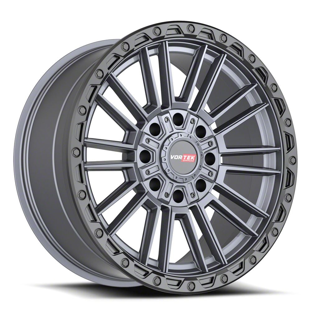 Vortek Off-Road VRT-604 Matte Titanium with Black Bead Ring 8-Lug Wheel; 17x9; 12mm Offset is a visually striking choice, offering a combination of rugged durability and modern styling. Its design complements off-road and sporty vehicles alike, enhancing the overall aesthetic appeal.