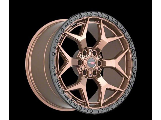 This 20x9.5 Vortek Off-Road VRT-603 Matte Bronze with Black Bead Ring 8-Lug Wheel; 20x9.5; 18mm Offset is completed in a high-quality matte bronze finish with black accents to make your wheel the envy of everyone. For added looks and durability, the wheels has a durable clear coat that withstand the rigors of daily driving.