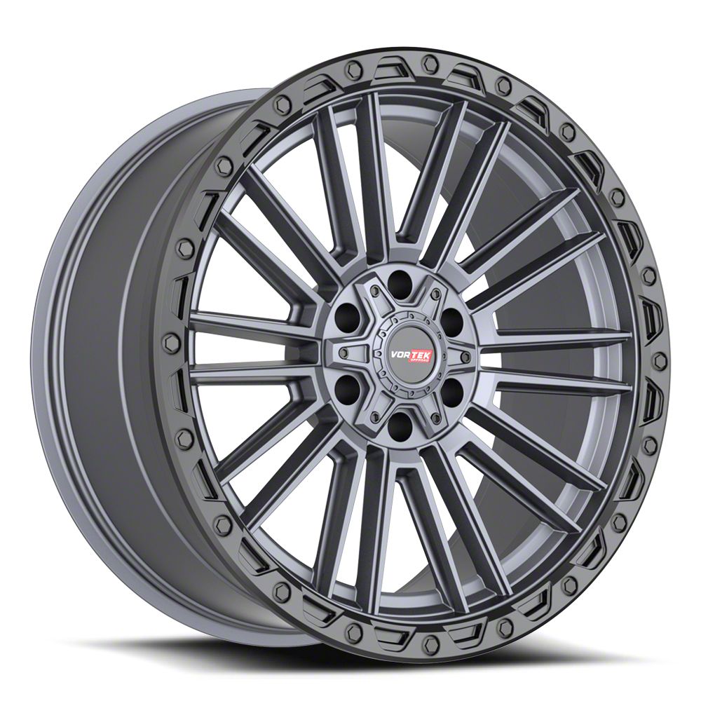 Vortek Off-Road VRT-604 Matte Titanium with Black Bead Ring 6-Lug Wheel; 18x9; 18mm Offset - Experience the sleek elegance of the Vortek Off-Road wheel. Its matte black finish adds a touch of sophistication to your vehicle, enhancing its overall appearance without compromising on durability. Perfect for a variety of vehicle styles, this wheel is a testament to the brand's commitment to quality and aesthetic excellence.