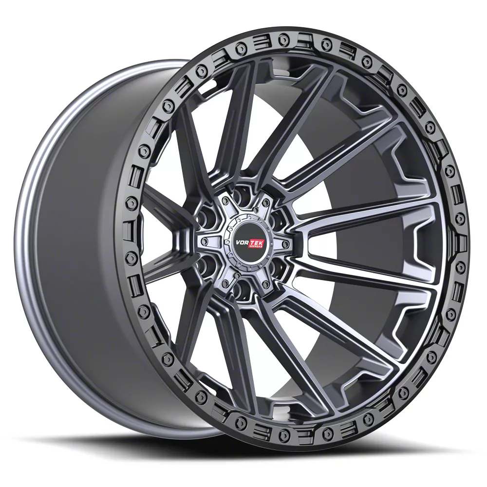 Vortek Off-Road VRT-601 Matte Titanium with Black Bead Ring 6-Lug Wheel; 20x10; -24mm Offset is a visually striking choice, offering a combination of rugged durability and modern styling. Its design complements off-road and sporty vehicles alike, enhancing the overall aesthetic appeal.