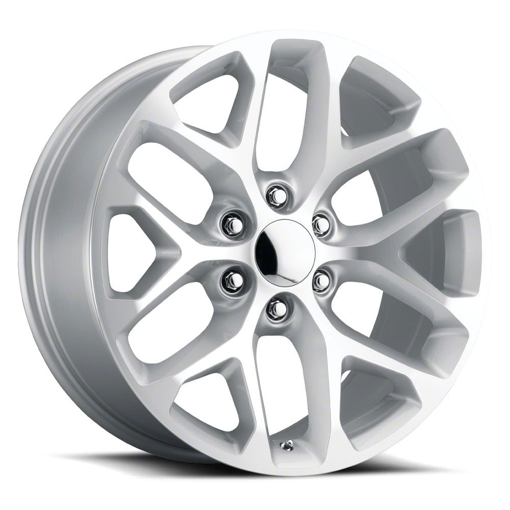 Voxx Replica Snowflake Style Silver Machined Face 6-Lug Wheel; 20x9; 27mm Offset exudes sophistication with its finish, offering a sleek and modern appeal to any vehicle it adorns. The design is meticulously crafted to enhance the aesthetic of your vehicle, giving it a distinctive and upscale look. Perfect for those seeking to elevate their vehicle's style, this wheel blends seamlessly with both contemporary and classic vehicle designs, making it a versatile choice for a wide range of vehicles. Its robust construction ensures durability, making it a reliable choice for drivers who value both style and quality.