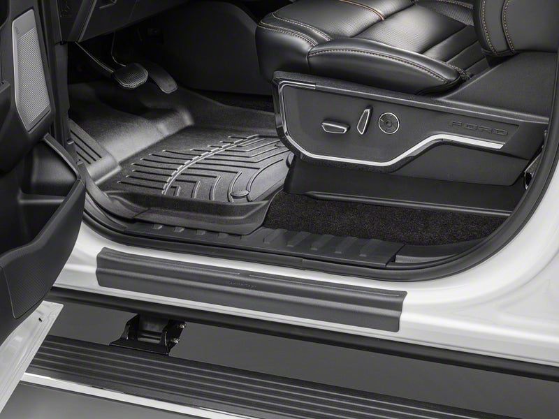 Durable Sill Protection. The Weathertech Door Sill Protector is designed to shield high-traffic entry areas of your vehicle from everyday wear and tear. With its edge-to-edge coverage, it defends against scratches, scuffs, and other minor damage while maintaining a factory-style look. The Weathertech Door Sill Protector fits 2023-2026 Ford F-250 Super Duty Regular Cab models.