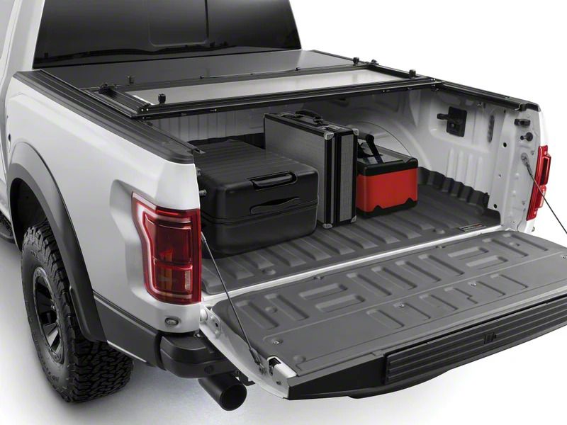 Maximize the security and durability of your truck bed with WeatherTech's AlloyCover. This low-profile hard tonneau cover features a user-friendly tri-fold design that makes installation and removal effortless. It features an AutoLatch II system that, when paired with a locked tailgate, provides unparalleled security, keeping your truck bed out of view. This truck bed cover mixes heavy-duty yet lightweight aluminum panels with watertight, reinforced vinyl coated hinges to help safeguard against any incursions. AlloyCover's low-profile design sits less than half an inch above your truck bed to provide a seamless look. A textured matte black finish keeps your truck looking sleek and stylish. The water-shedding design, along with reinforced vinyl coated hinges, route water away from the bed without gutters or drains. The hard tonneau cover overlaps the bed rails with a continuous seal along the entire length of the side rails, preventing elements from entering the truck bed.