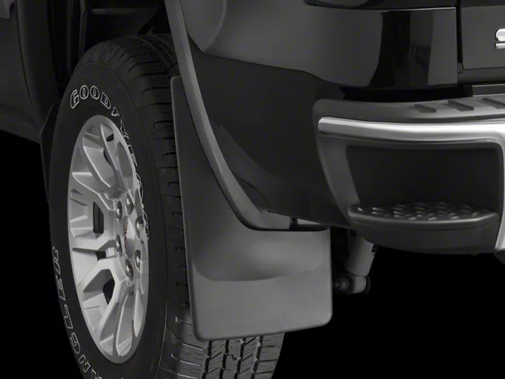 Can Withstand Tough Terrains. This pair of black Weathertech No Drill Rear MudFlaps are molded from proprietary thermoplastic resin, so they will protect your 2014-2018 Sierra from mud even if you're going through rough roads and terrains. Because the mudflaps are UV protected, they won't lose their color even if they are constantly exposed to the sun.
