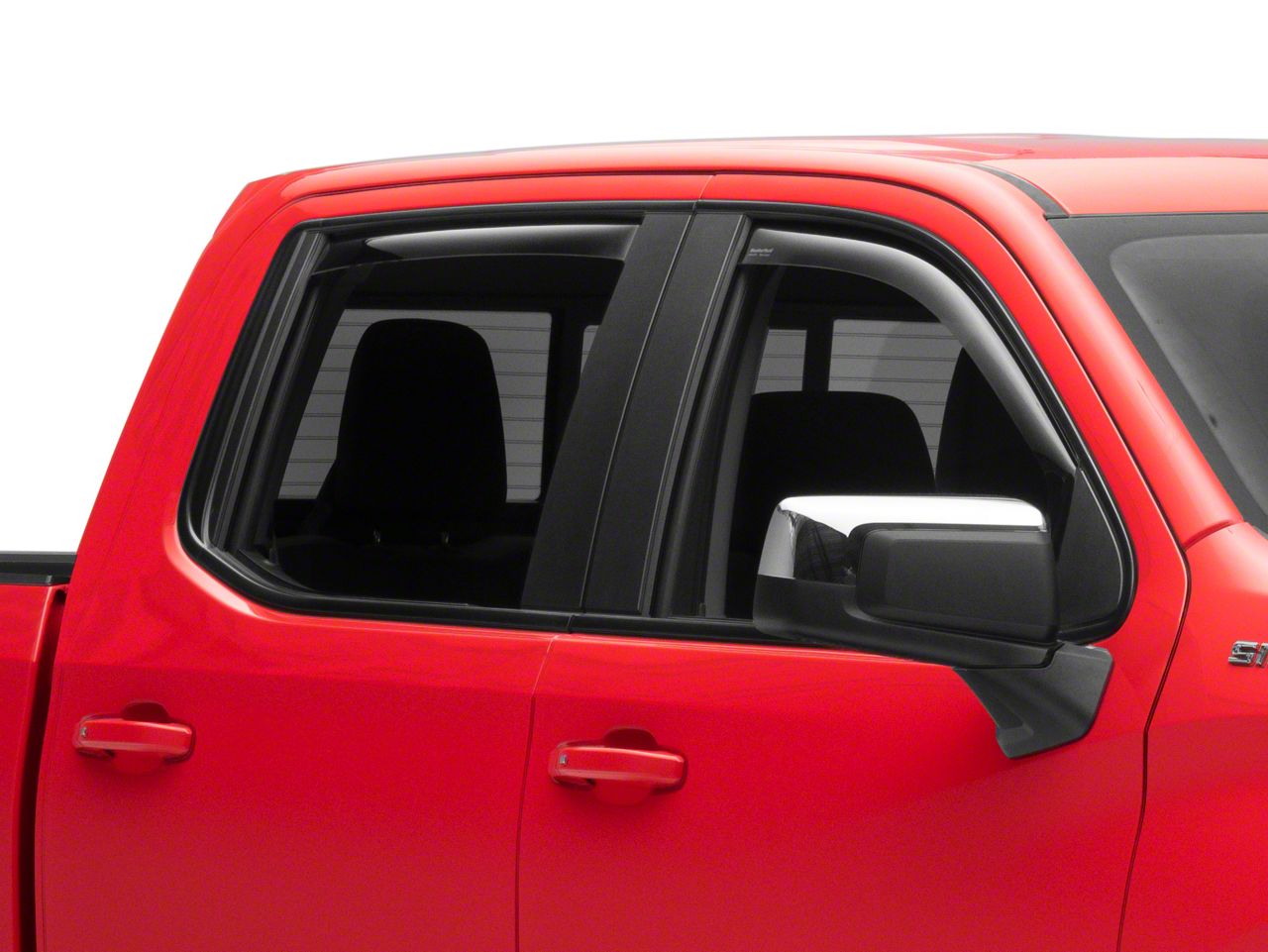 Application. These Weathertech Side Window Deflectors; Front and Rear; Dark Smoke were designed to fit all 2019-2023 Silverado 1500 Crew Cab w/ Chrome or Black Window Sill models.