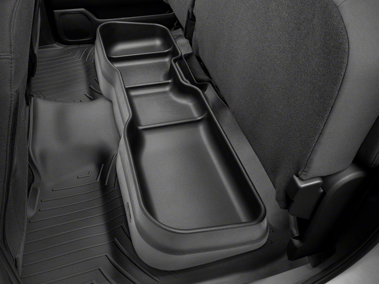 Secured Cargo Transport. Have your tools whenever you need them and keep them well organized with this Weathertech Under Seat Storage System. Designed as a reliable compartment area, that is convenient and durable it offers precision molding that matches the contour of your seat, with curved high walls to separate the various items you have. It utilizes your upper seats and curves to give ample room between the items and the back plate of your rear chairs.
