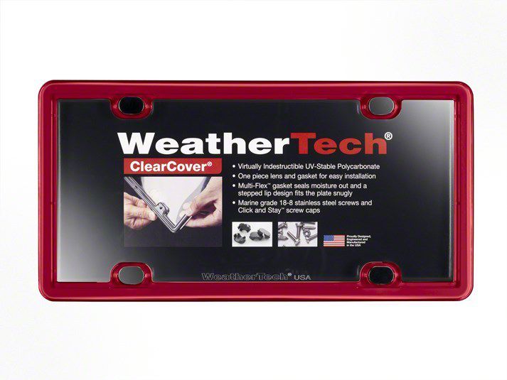 Durable, Striking, and Stylish License Plate Protection. The Weathertech ClearCover License Plate Frame is designed to provide a secure and stylish fit for your license plate, offering robust protection with a sleek look. Developed with a striking Red color scheme, this frame enhances the appearance of your vehicle.