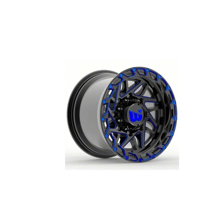 20x10 Western Wheels BOULDER Gloss Black with Blue Milling Spokes and Spot 6-Lug Wheel is completed in a high-quality gloss black finish that will be the envy of everyone. There is blue steel millings that provide a striking contrast.