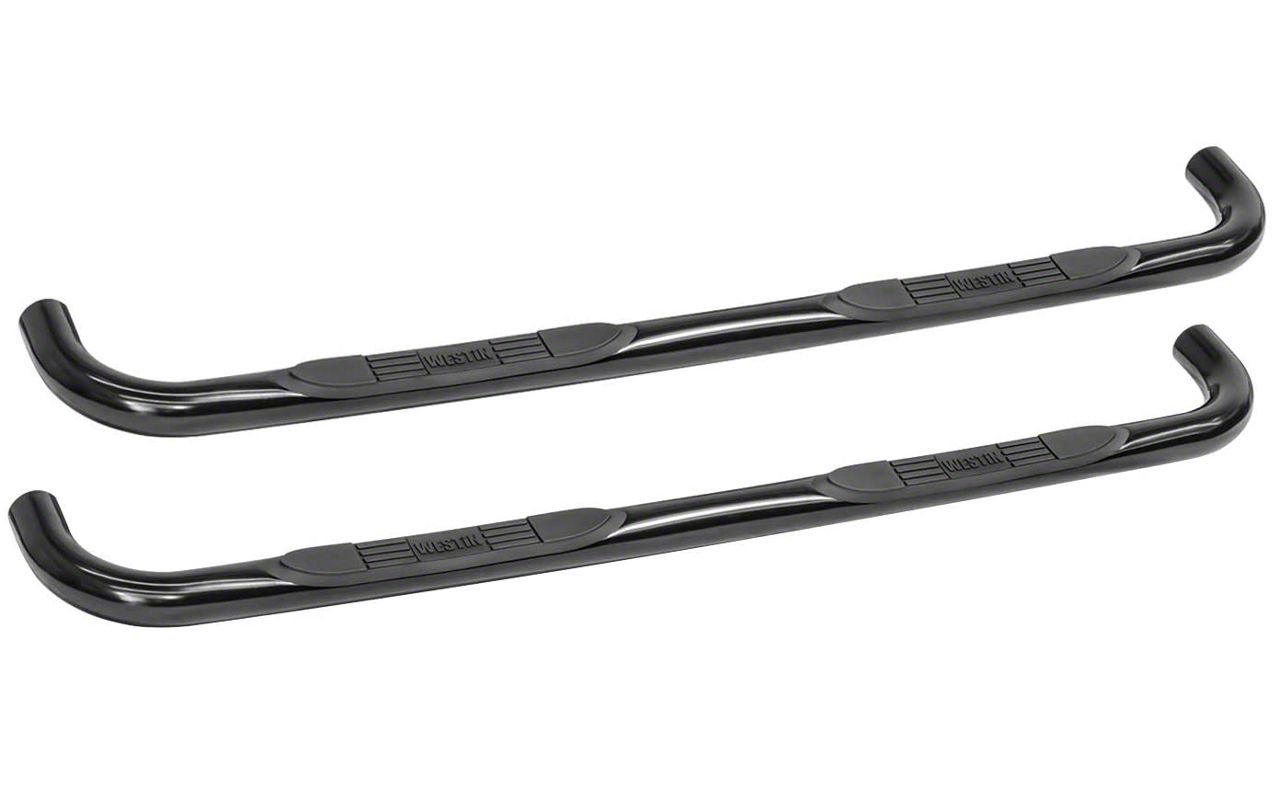 Durable Protection. The E-Series 3-Inch Nerf Side Step Bars in black provide a sturdy and stylish step solution to assist entry and exit from your vehicle. These nerf bars protect the rocker panels from damage while adding a functional and rugged look to the truck. They offer both utility and aesthetic benefits for daily driving and off-road use.