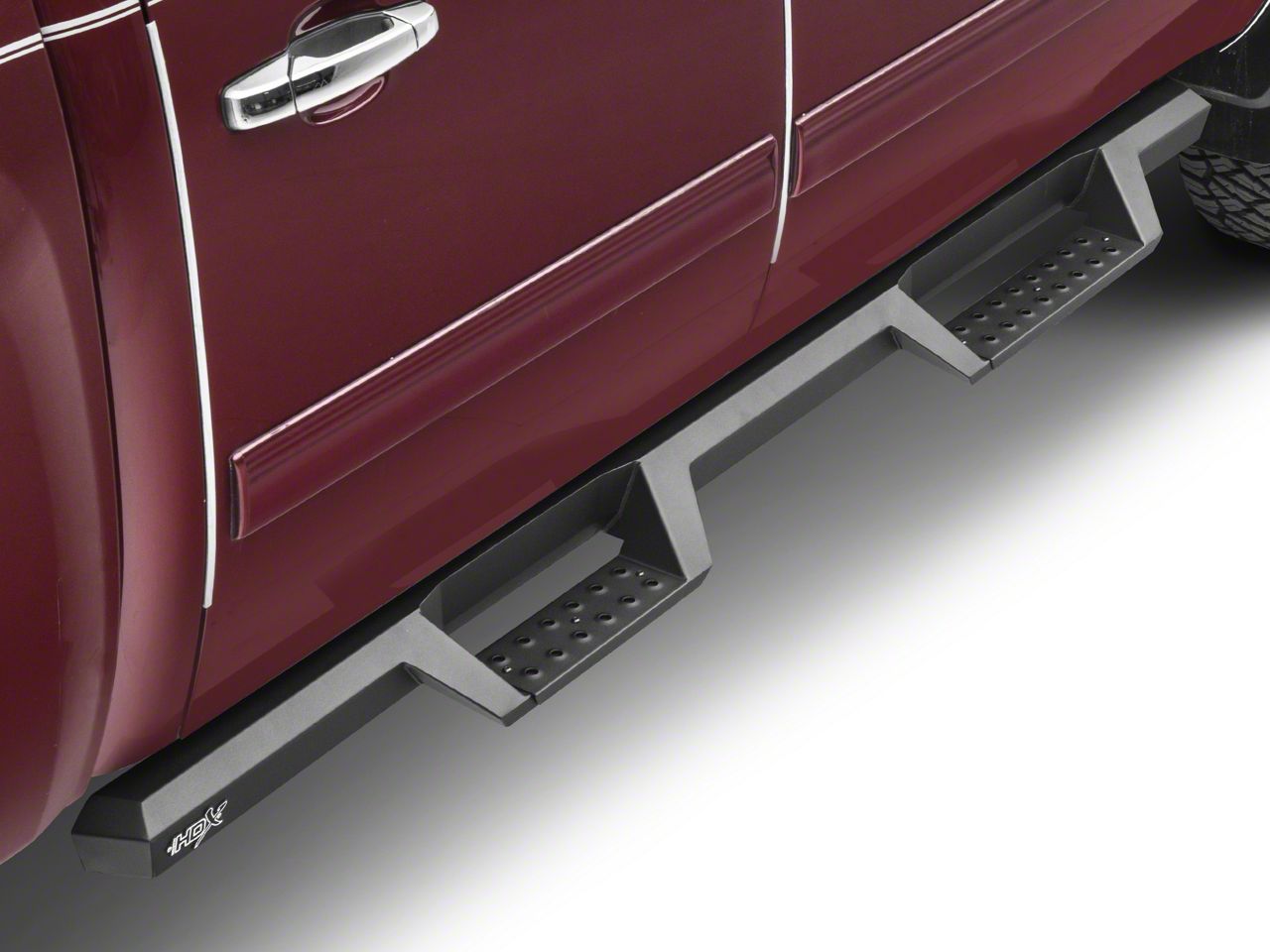 Outbeats the Competition. These HDX steps provide an additional 2" of stepping area over the competition. Not only that, but they add instantly styling to any truck. Manufacturer also crafted these steps to be wide and slip-resistant to give you a firm foothold on your vehicle. Die stamped for easier cleaning, the Nerf Step Bars also provide light protection to the rocker panels and the lower door areas of your Silverado.