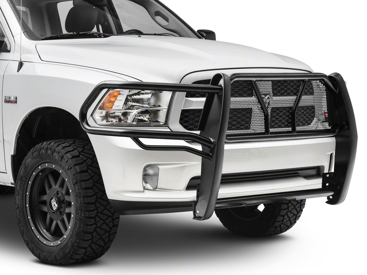 A Work Horse for Your RAM. These HDX black grille guard is designed to look its best while putting in a full day's hard work in a commercial environment. Fully welded uprights protect a punch plate grille and manage to keep your RAM 1500 looking superb driving through bushes deflecting flying rocks and other debris while towing a stalled vehicle and warding off the occasional animal. It's just another day at work.