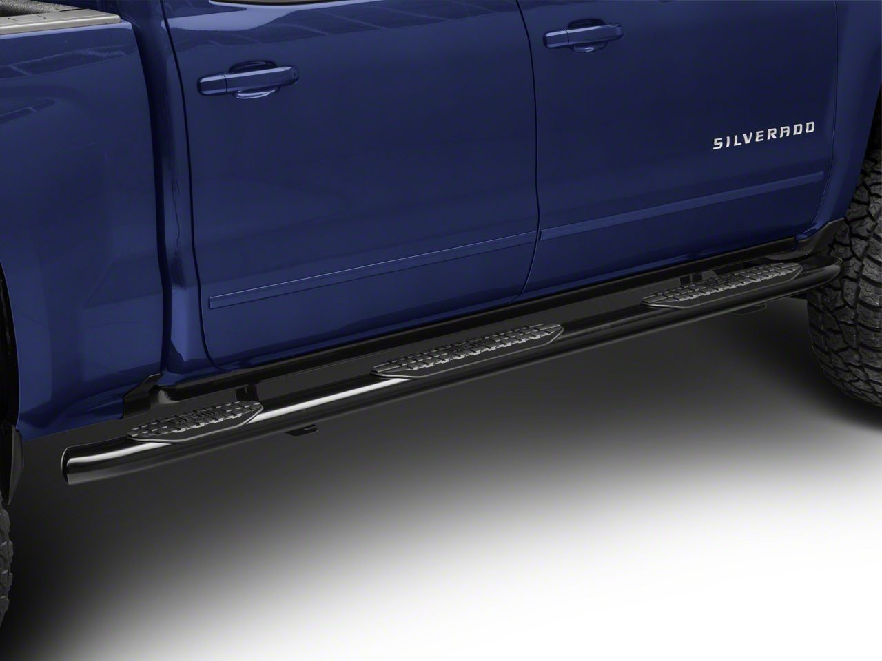 Stylish Functionality. Besides providing a secure footing, these bars complement your Silverado’s appearance. Their black powder coat finish contrasts beautifully with the vehicle’s exterior coating. With domed ends, you are assured that no end caps or bolt heads will be left exposed thus optimizing the appearance of your truck. What’s more the side step bars do not affect your Silverado’s ground clearance and also secure its side-body from damage in parking lots.