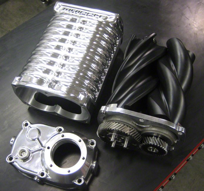Whipple Technology. The Whipple W175AX 2.9L front entry twin-screw supercharger significantly outperforms the competitions 1.9L and 2.3L roots-type systems. Whipple's inverted design allows for an oversized intercooler core, when compared to other companies smaller intercooler cores, giving the Whipple lower air charge temperatures which allows for more boost and timing to be run on pump gas. Whipple's superchargers feature a 3x5 rotor combination for increased RPM capacity, large diameter for increased airflow and small leak path, as well as increased helix for optimal sealing. This 3x5 rotor combo significantly increases in airflow under the curve, when compared to other companies less efficient 4x6 roots design. Whipple Superchargers feature a massive oversized intercooled air-bypass system for an industry leading reduction of burst knock and incredible fuel economy.
