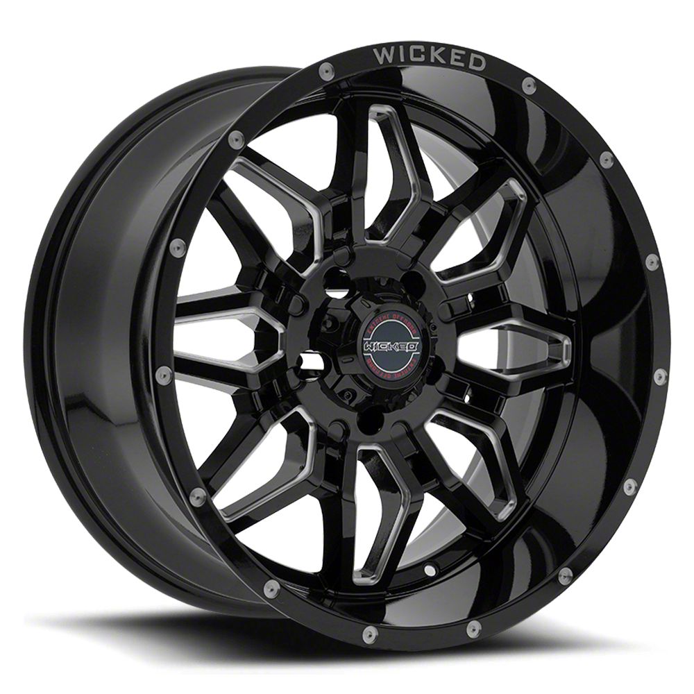 Application. The Wicked Offroad W909 Gloss Black Milled 6-Lug Wheel; 20x10; -24mm Offset, with a backspace of 4.556 Inch, 115.8mm and a bolt pattern of 6 x 139.7mm (6 x 5.5-Inch), is designed to enhance alignment and stability for a smooth driving experience. Specifically tailored to fit 2014-2018 Silverado 1500 models, it ensures a perfect blend of style and functionality. Sold individually, this wheel is an ideal upgrade for your vehicle.