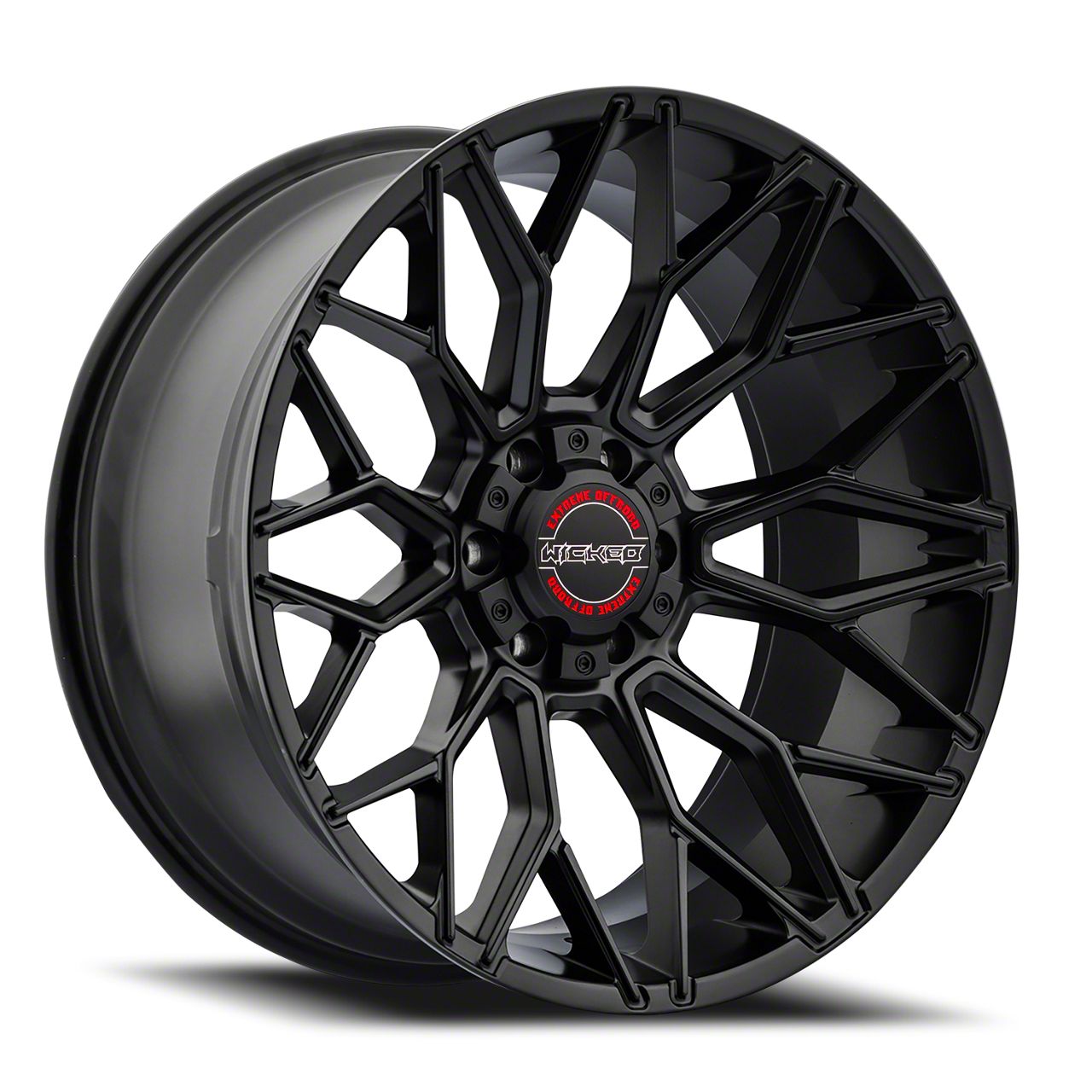 Wicked Offroad W934 Satin Black 6-Lug Wheel; 20x10; -19mm Offset. The Wicked Offroad W934 Satin Black 6-Lug Wheel offers a striking balance of style and refinement. Its unique design accentuates the vehicle's aesthetic, while the premium construction underscores its robust nature. This wheel is a perfect choice for those seeking both elegance and a strong visual statement.