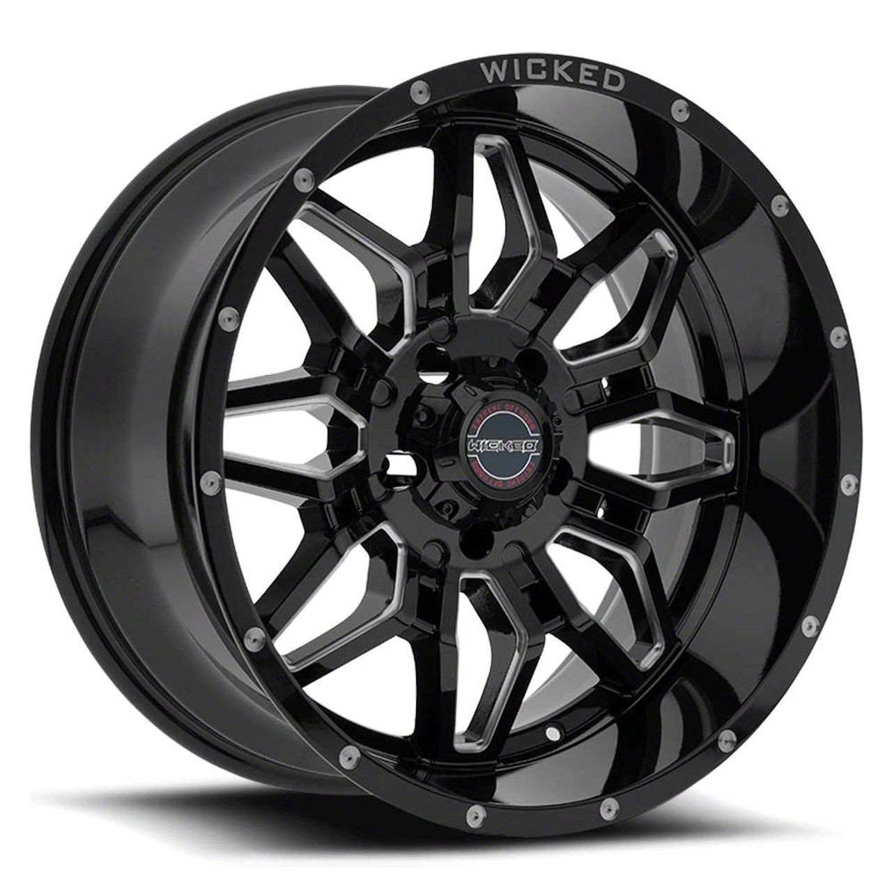 The 20x10 Wicked Offroad W909 Gloss Black Milled 6-Lug Wheel is completed in a high-quality gloss black finish, with steel milled accents. Thanks to a durable clear coat, the finish looks amazing and also protects against the rigors of driving.