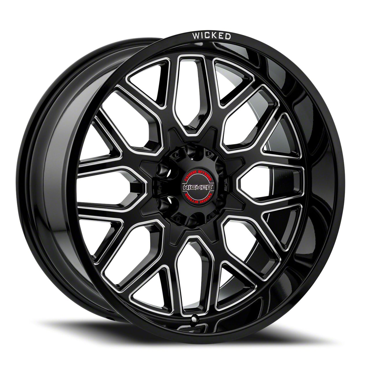 This 20x10 Wicked Offroad W938 Gloss Black Milled 6-Lug Wheel is completed in a high-quality gloss black finish with steel milled accents that will be the envy of everyone. For added strength and aesthetics, there is a durable clear coat that withstands the rigors of daily driving.